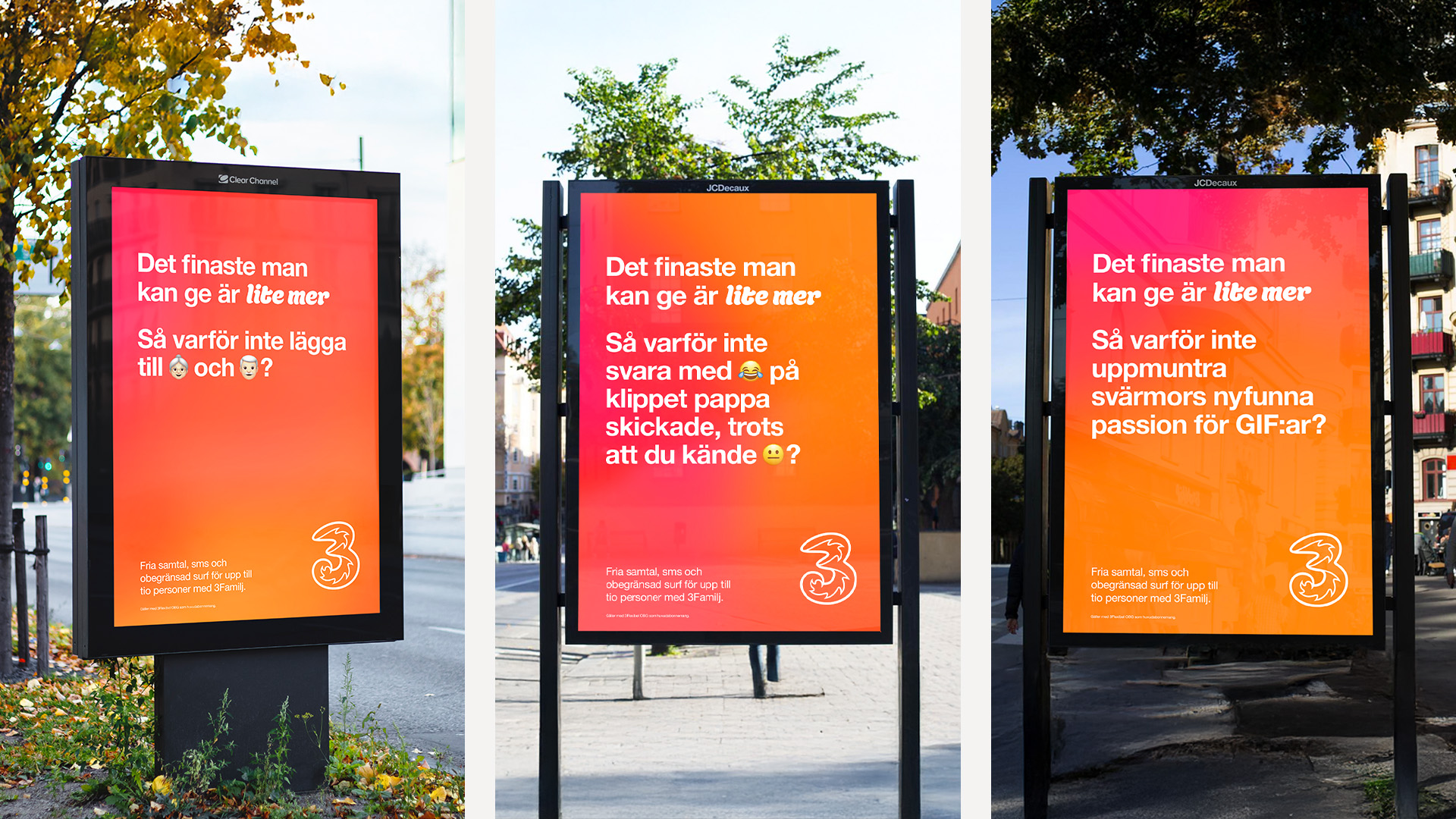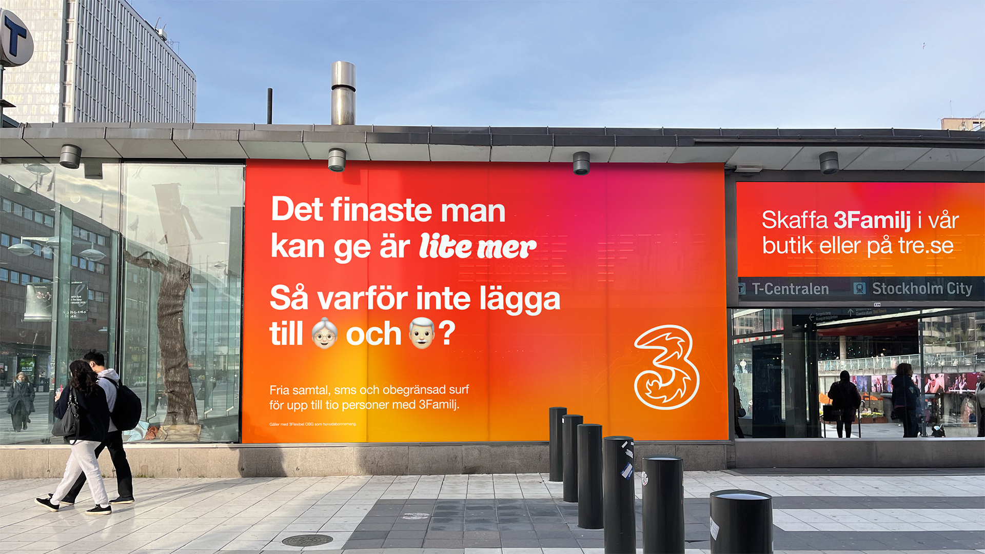 Tillsammans med Tre bygger vi vidare på konceptet ”Det finaste man kan ge är lite mer”. Den nya familjekampanjen lyfter relationen mellan tonåringar och föräldrar – och visar hur ett enkelt sms kan förvandla oro till lättnad. Kampanjen syns brett i film, utomhus, radio, digitalt och sociala medier. I utomhusenheterna lyfts fler små familjeögonblick som med glimten i ögat påminner om hur lite mer faktiskt kan betyda allt.