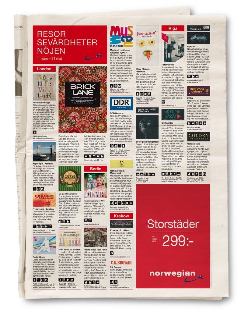 En middag på ett slakthus i Berlin, rullskridskor till musik i London eller kanske ett besök på fotografiska museet i Riga? I Norwegians nya kampanj lyfter vi fram de mest intressanta platserna att besöka i Europas storstäder just nu . Med hjälp av deras egna reklam och affischer. Affischerna belönades med Silverägg 2014.