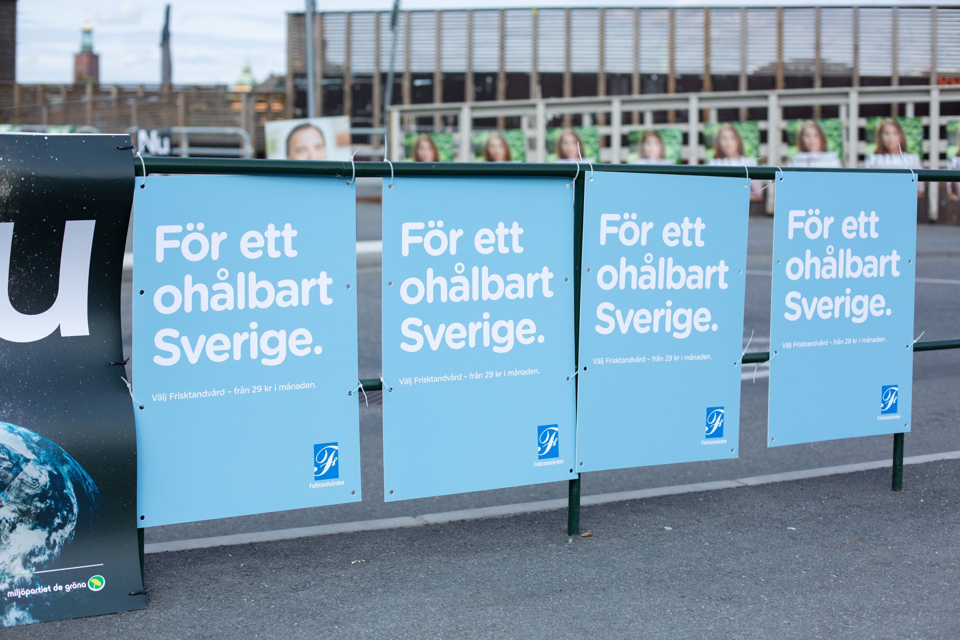 During the peak of the national election in Sweden, the Public Dental Service in Stockholm put up their own poster campaign alongside the Swedish political parties campaigns in central Stockholm. The message was to choose the best offer for dental care in the city. The campaign ran in social media.