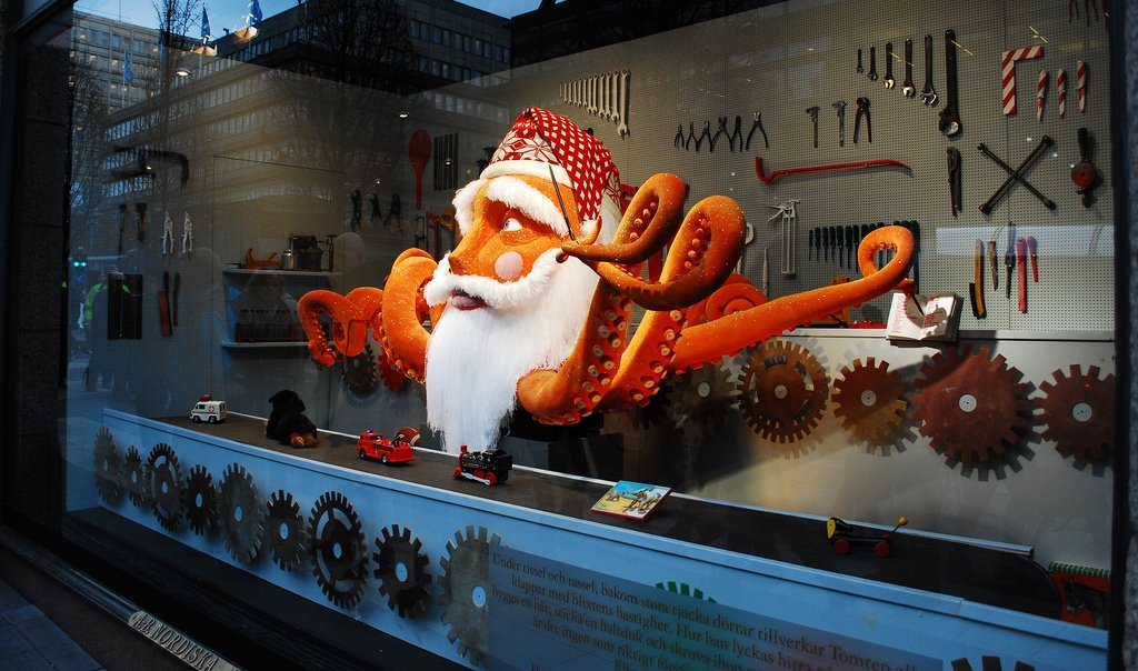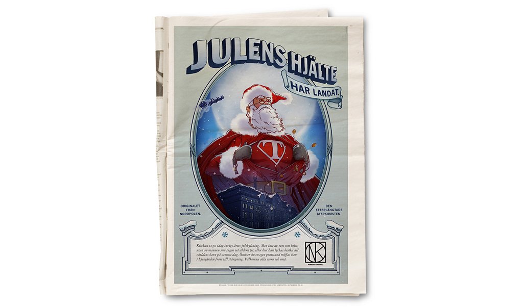 Tomten som superhjälte är temat för årets julskyltning på NK. NK:s dekorfirma Look stod för utformningen av skylten medan vi skrev berättelserna och gjorde en affischaktig annons tillsammans med illustratör Fredrik Tjernström.