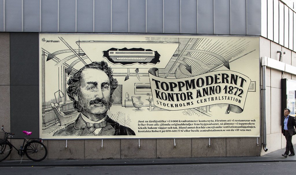 Jernhusen is about to prepare 8000 squaremeters of office space in the building of the Stockholm Central Railway Station. The billboard shown below is located by the future main entrance and summarises the office-spaces unique approach; namely high-tech ventilation in combination with the building’s original details from the late 19th Century.