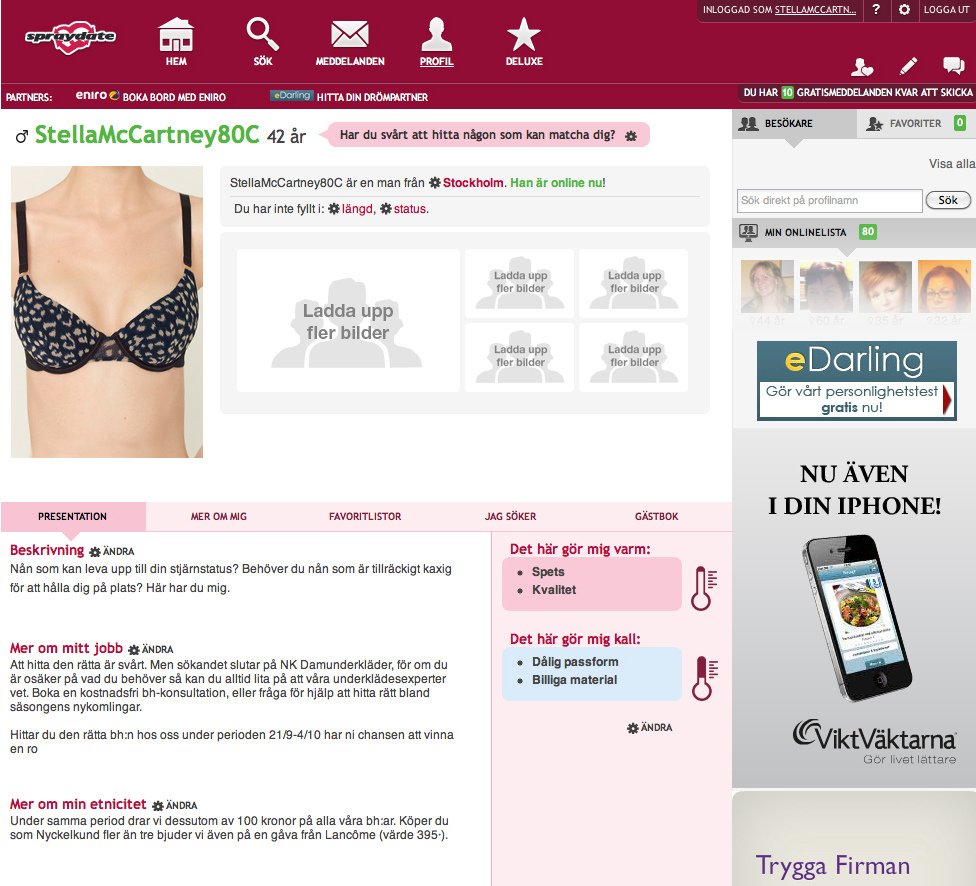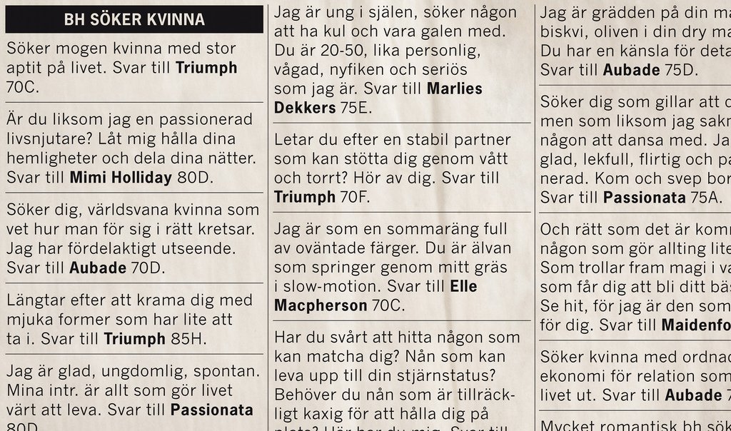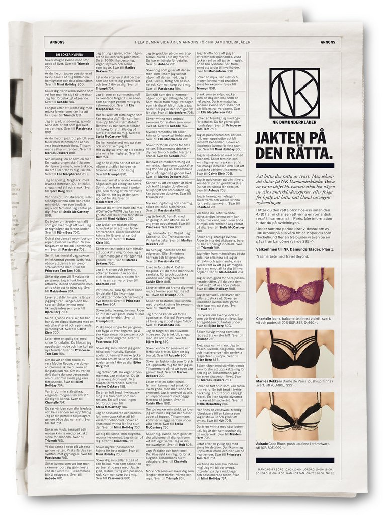 Det är svårt att hitta den rätta. Vi ville berätta att sökandet slutar på NK Damunderkläder – där finns nämligen en perfekt bh för alla bröst. Vi lät ”Chantelle”, ”Aubaude”, ”Stella McCartney” och andra bh:ar från NK Damunderkläder annonsera efter matchande kvinna. Ett hundratal unika kontaktannonser lades ut på dejtingsidor på nätet, helsidor i dagspress och genom ett DR som skickades ut till NK’s kunder. Som grädden på kärleksmoset vann en av de kvinnor som fann den rätta under kampanjperioden en romantiskresa till Paris – tillsammans med sin nya bh. Försäljningen ökade med hela 60 procent, jämfört med samma period föregående år. Samtidigt som den svenska klädmarknaden som helhet minskade sin försäljning med 7,7 % .