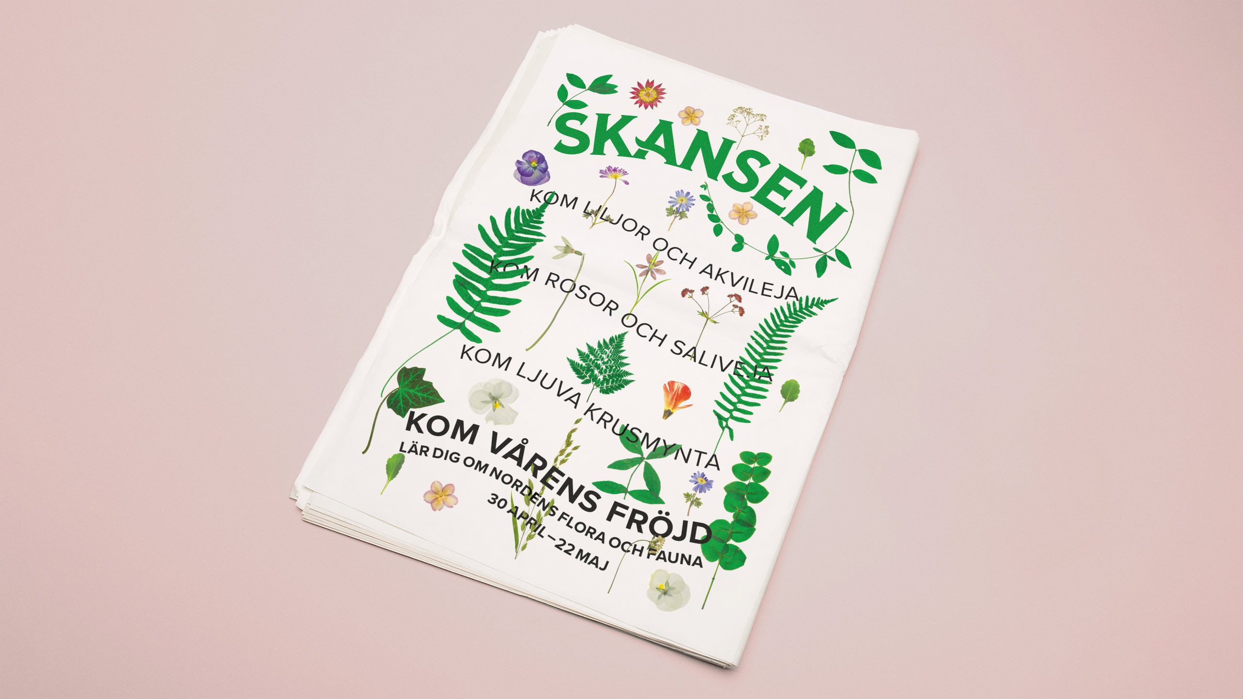 När Skansen skulle ha trädgårdsdagar grävde vi där vi stod och upptäckte de 300 år av trädgårdshistoria som finns representerad på Skansen. Kampanjen blev bokstavligt talat framodlad och växter och blommor pressades med gammeldags teknik. För att få ut mesta möjliga av projektet byggde vi utomhustavlor med skivor av glas tätt sammanpressade och en mängd nordiska blomsterarter som ögonfångare. Bland de många arter som förekom i kampanjen använde vi bland annat akvileja, gulrot och västerbottnisk hoppetossa.