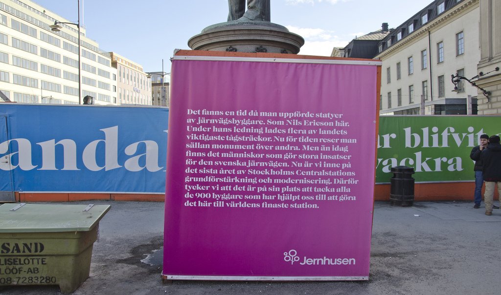 Förr i tiden uppförde man statyer av järnvägsbyggare. Som Nils Ericsson, som står utanför Stockholms Centralstation. Nuförtiden reser man sällan monument över andra. Men än idag finns det människor som gör stora insatser för den svenska järnvägen. När Jernhusen nu går in på det sista året av renoveringen av Stockholms Centralstation, så väljer man att hylla och tacka några av de 900 byggjobbarna som hjälpt till.