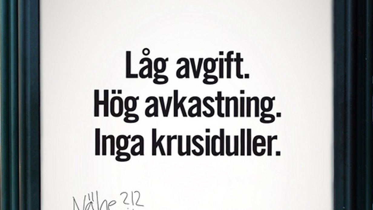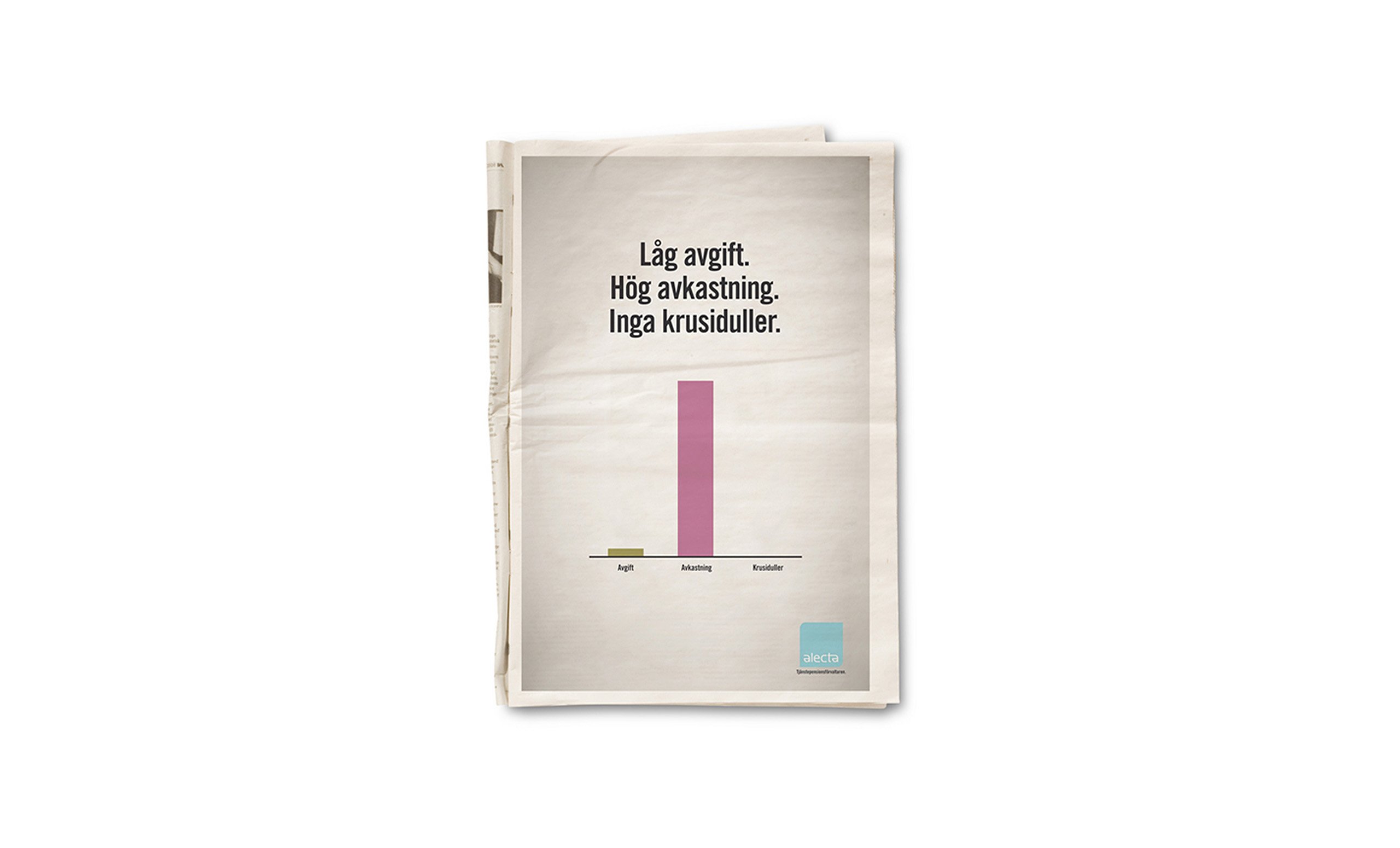 Säg hej till pensionsbolaget Alecta, vår nya kund. Alecta är ett väldigt tydligt bolag på en väldigt otydlig marknad. Alecta har nämligen inga mäklare eller säljare som skär emellan. Alecta ägs av sina sparare, och har alltså inga utomstående ägare som vill ha del av vinsten. Alecta säljer inga onödiga kringprodukter eller tilläggsförsäkringar, bara tjänstepension. Och den som sparar hos Alecta betalar en väldigt låg avgift och får väldigt hög avkastning. Inga krusiduller helt enkelt.