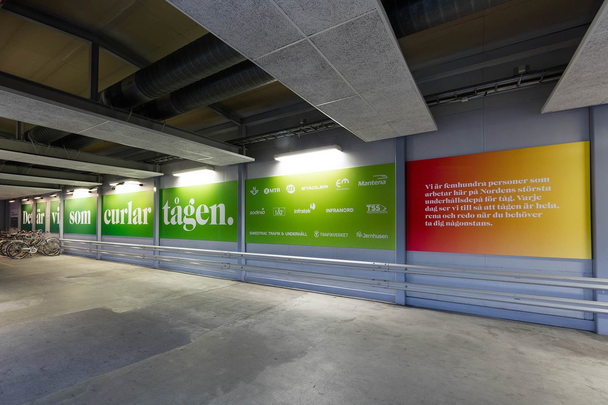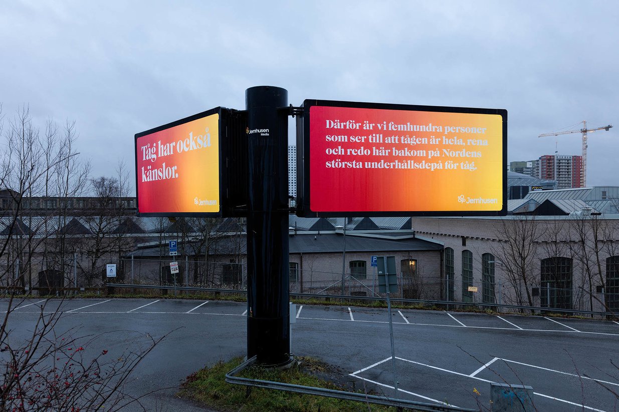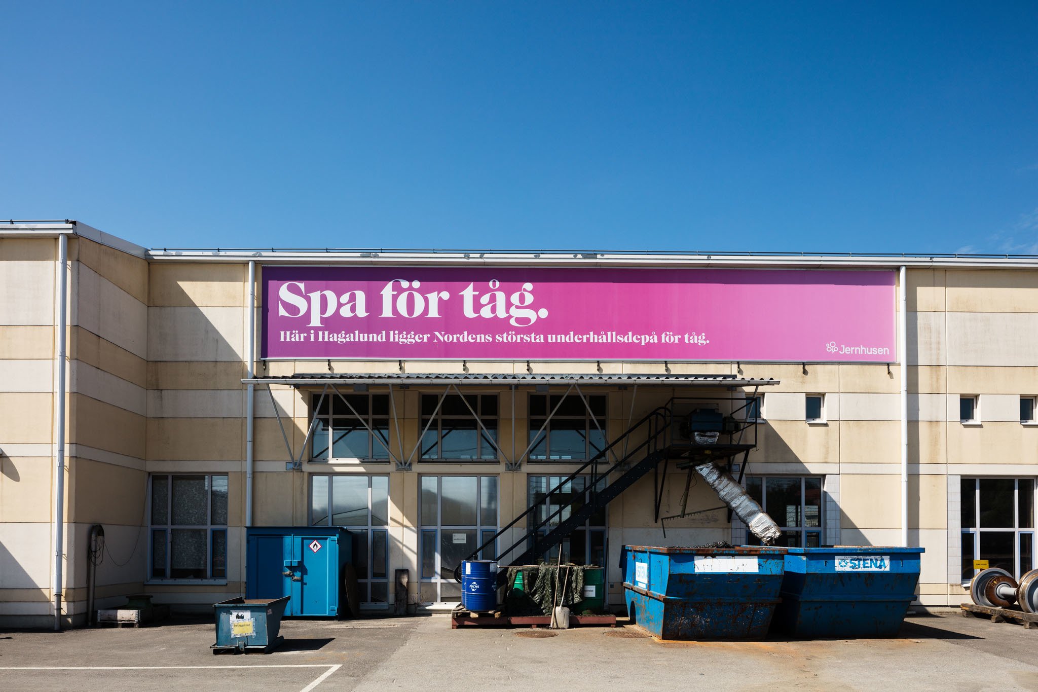 The Hagalund depot in Solna outside Stockholm is the largest maintenance depot for trains and other vehicles in the Nordic region. Our campaign describes Jernhusen as a “train pamperer” on nearby walkway tunnel-posters, on the depot buildings and on a large double billboard seen from the highway.