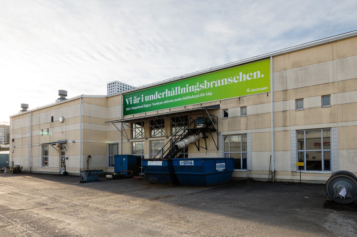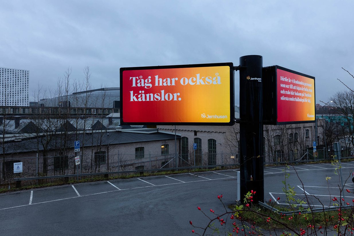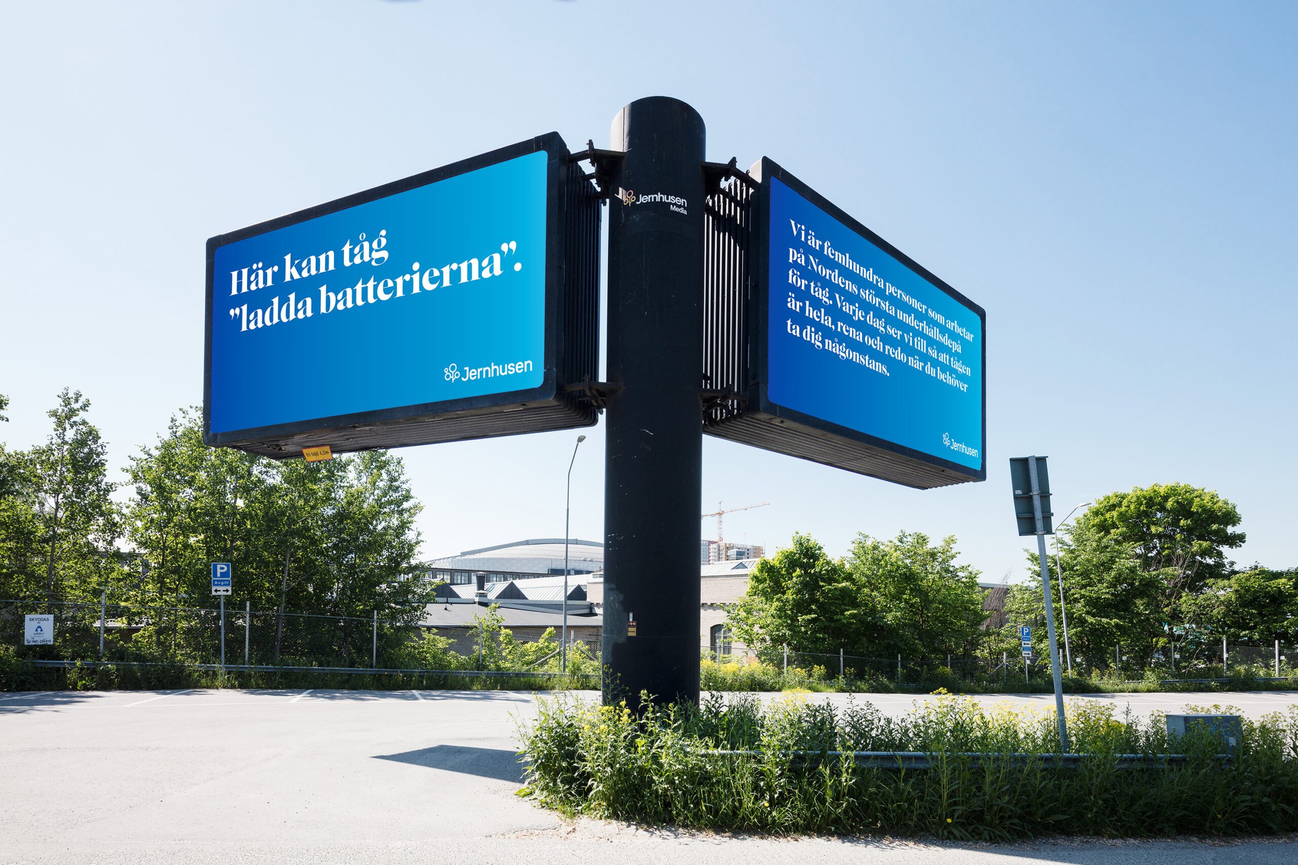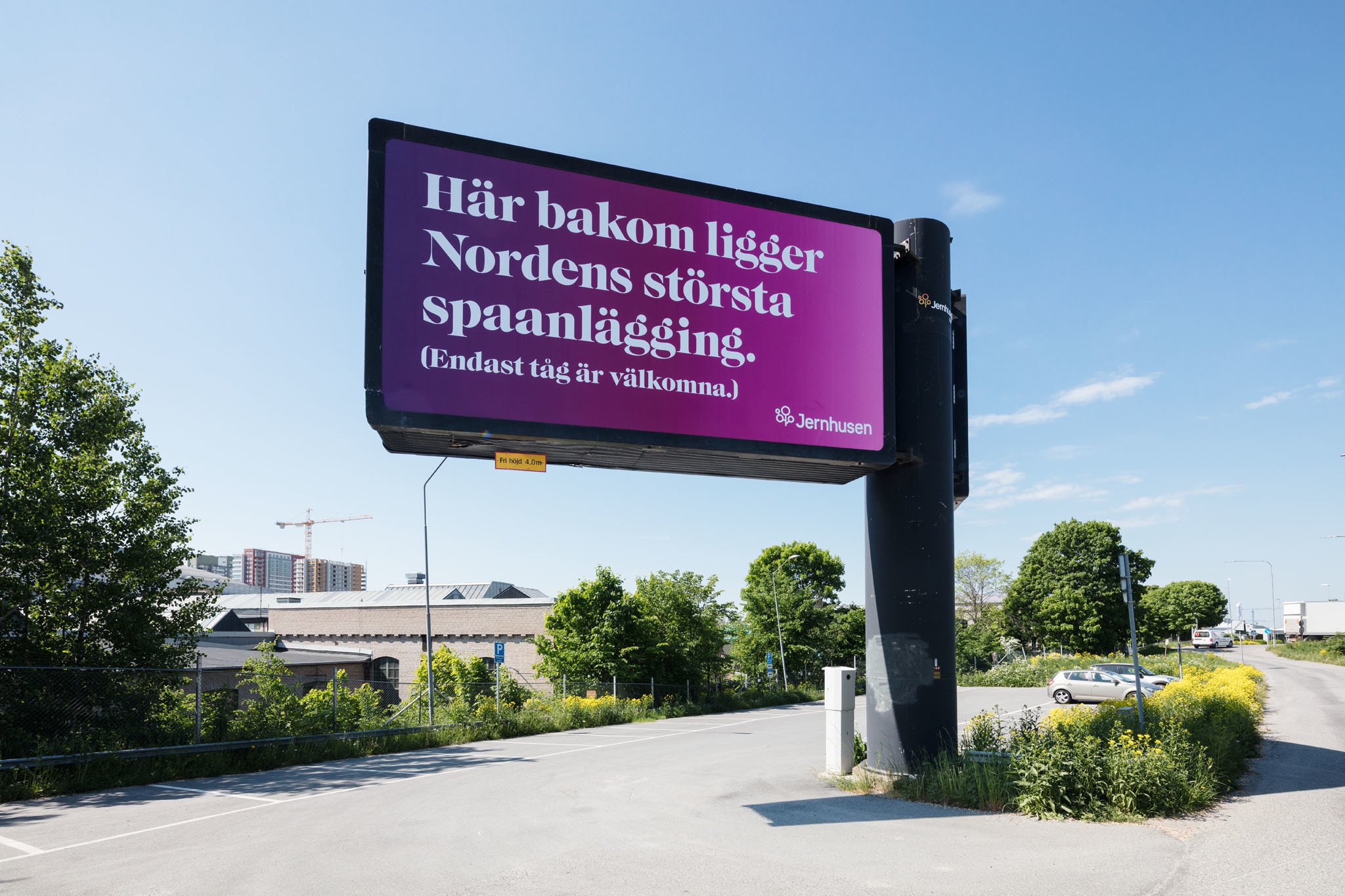 The Hagalund depot in Solna outside Stockholm is the largest maintenance depot for trains and other vehicles in the Nordic region. Our campaign describes Jernhusen as a “train pamperer” on nearby walkway tunnel-posters, on the depot buildings and on a large double billboard seen from the highway.