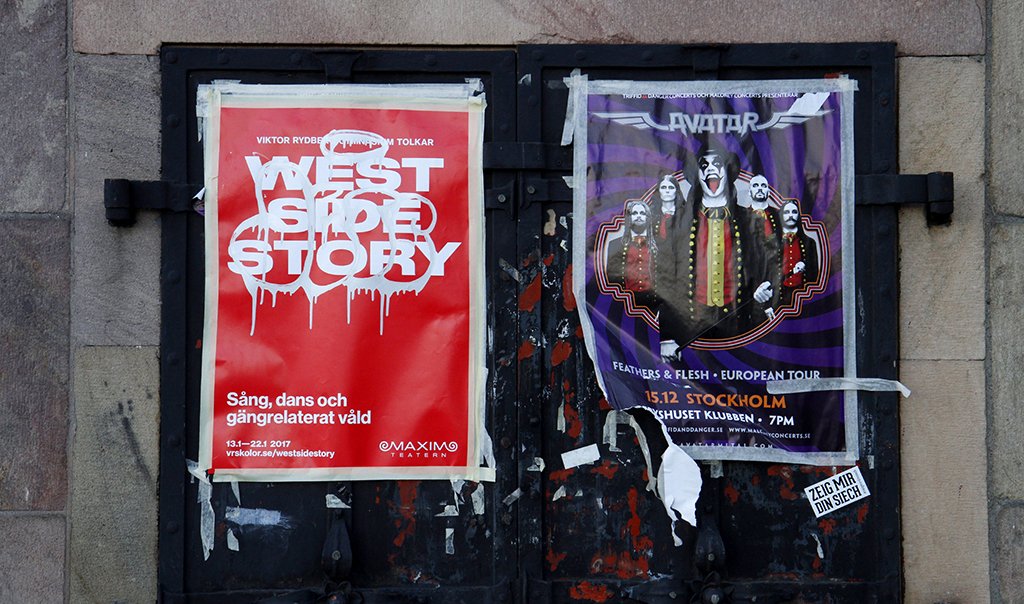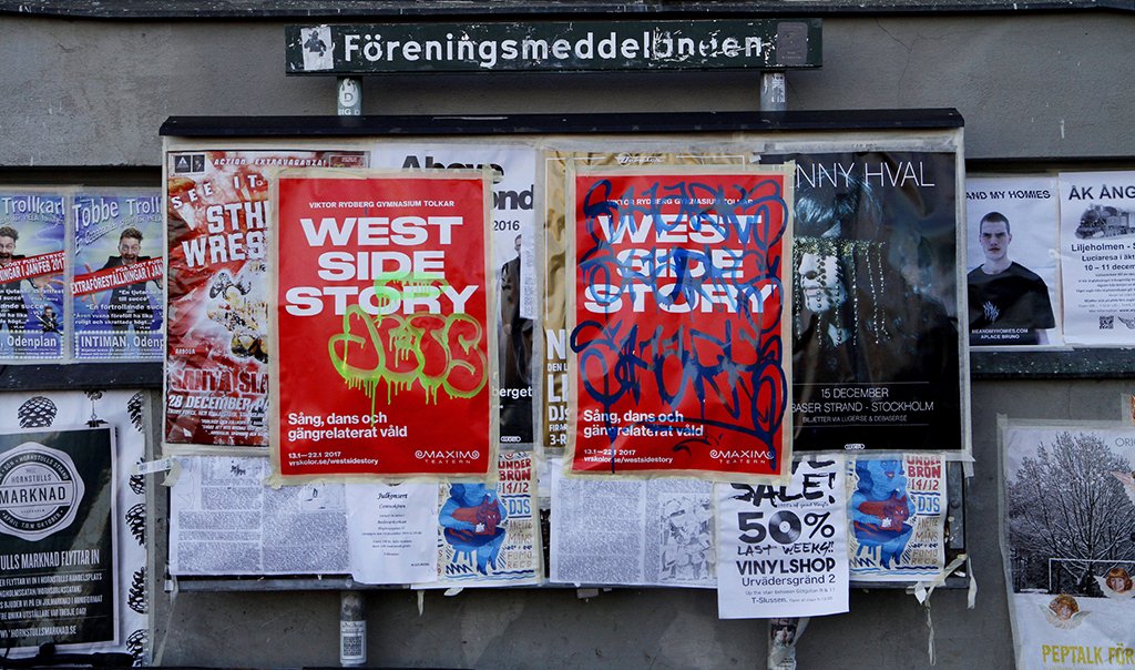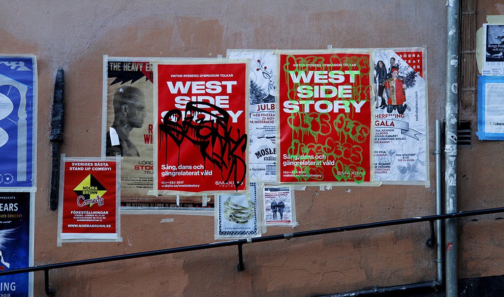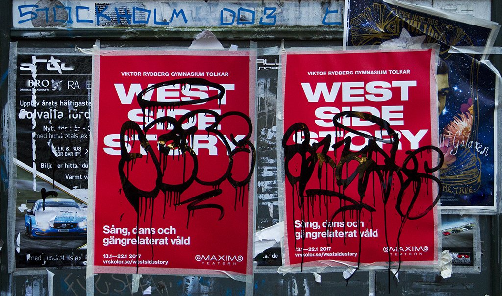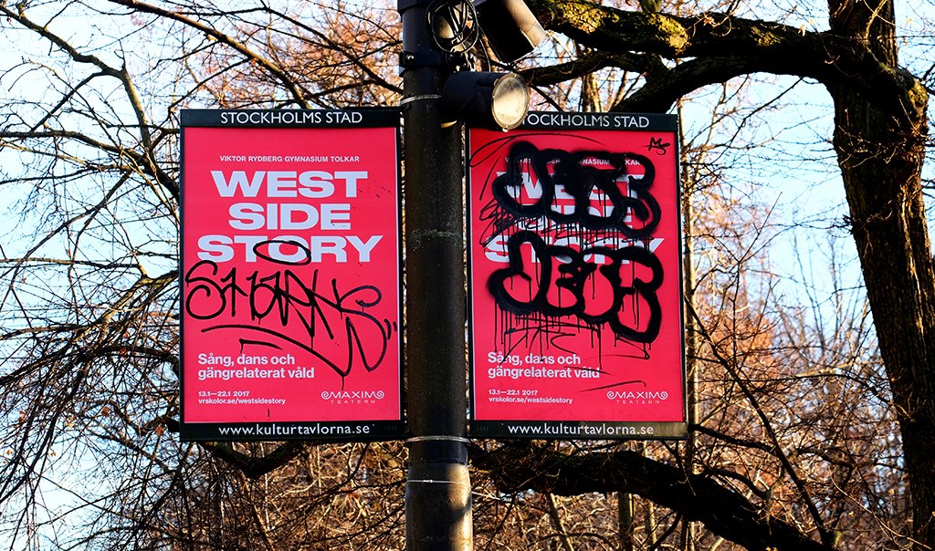 Every year the students of Viktor Rydbergs Gymnasium put on a musical. This year was the classic West Side Story which played at the Maxim Theater in Stockholm. The plot revolves around the two street gangs, the Jets and the Sharks set in New York in the mid 1950s. We chose to do a modern interpretation when various gangs tagged posters. A large number of the posters, both awarded and on purchased surfaces had unique tags. The campaign was launched stealthily with documentary films posted on Instagram and Facebook minus a sender. And at the ticket purchasing counter at Ticketmaster everyone had to choose sides as well. Half the theatre was taken up by the Jets and the other half by the Sharks. The program sheet was presented in two ‘rival gang’ versions before the show. Whose side are you on?