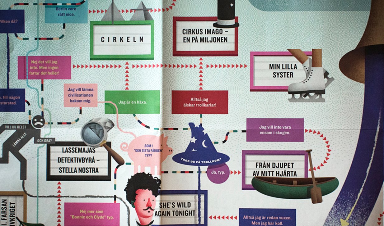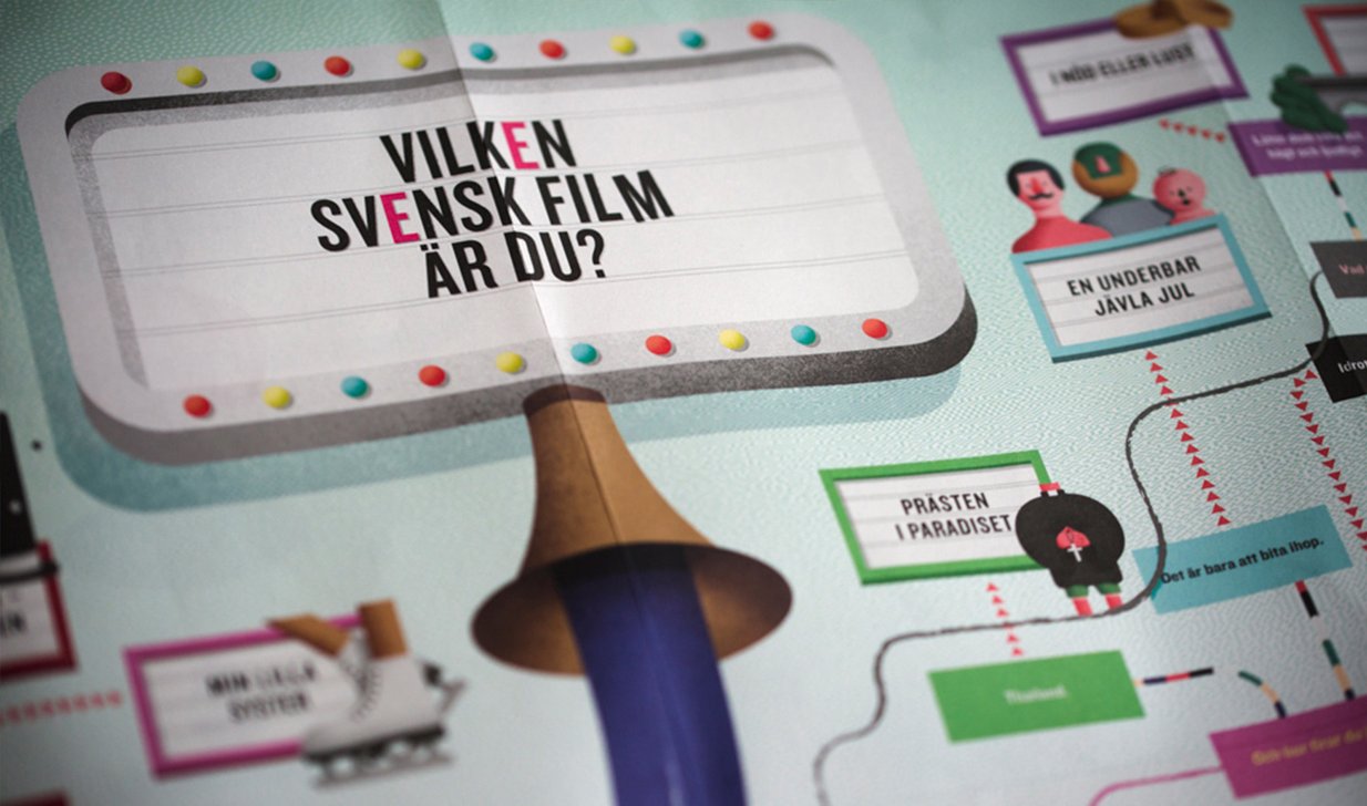 There are still people that thinks every Swedish film is the same way. That they look and sound alike. That Swedish film is an own niche. But here in Sweden there were over forty very different films made during 2015. To show the diversity and the variegation we made a flowchart where questions and answers led to one of this years films. The test was sent out as a poster which worked as an invitation to “Guldbaggegalan”. The test could also be done the digital way at vilkensvenskfilmärdu.se where the result was connected to a trailer and more information about the film.